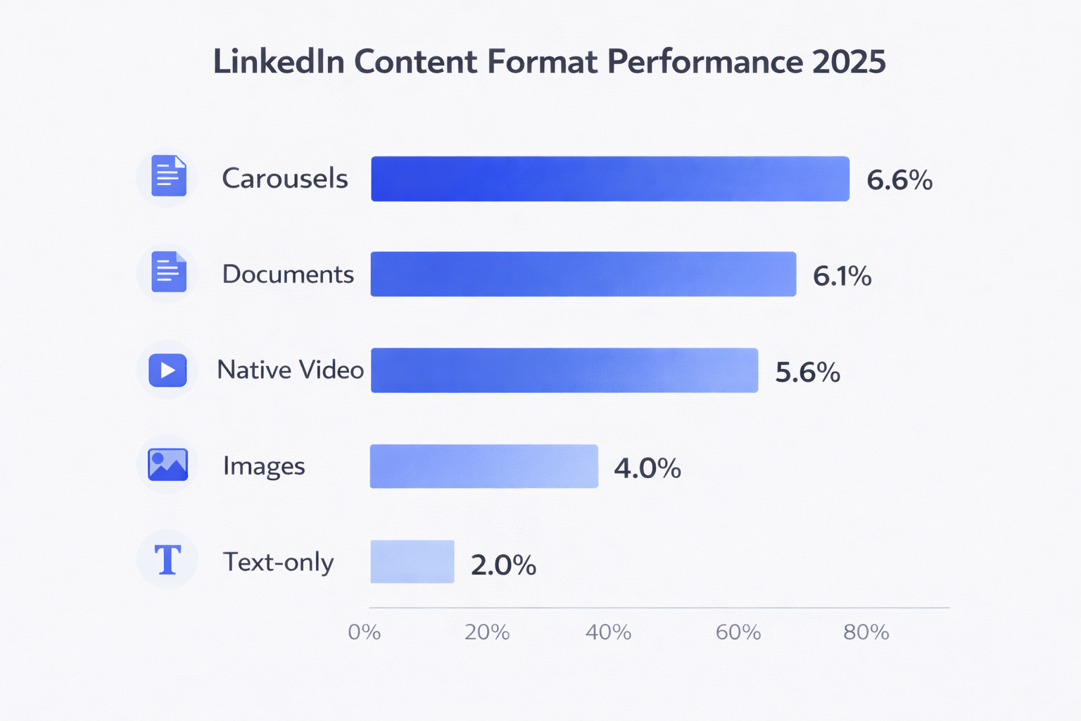 - Carousels 6.6% engagement, Documents 6.1%, Native video 5.6%, Images 3.4-4.0% – video uploads up 34% YoY with native videos getting 5x more engagement than external YouTube/Vimeo links