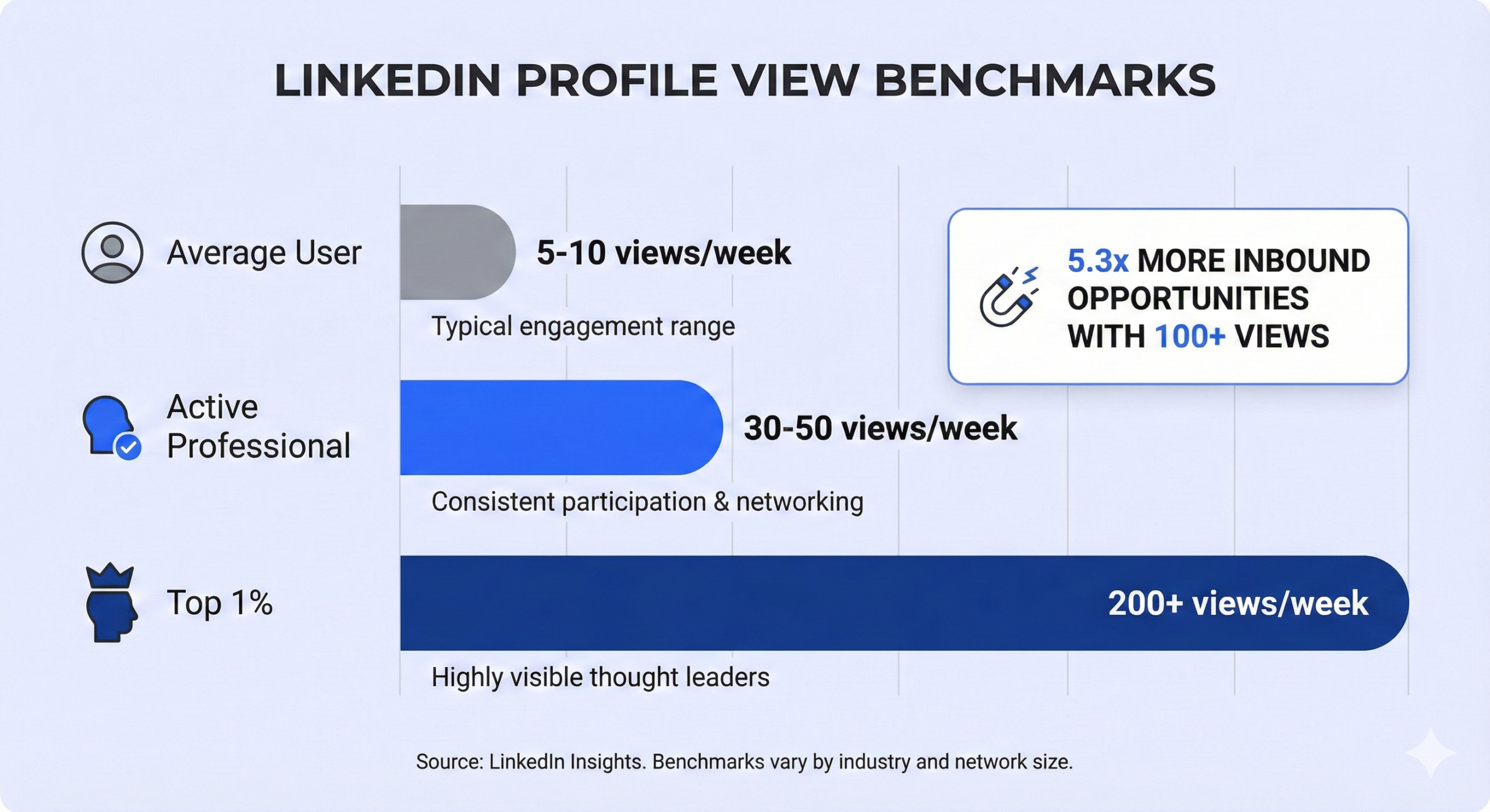 - Average LinkedIn user gets 5-10 profile views per week – passive existence baseline, not actual growth or engagement
