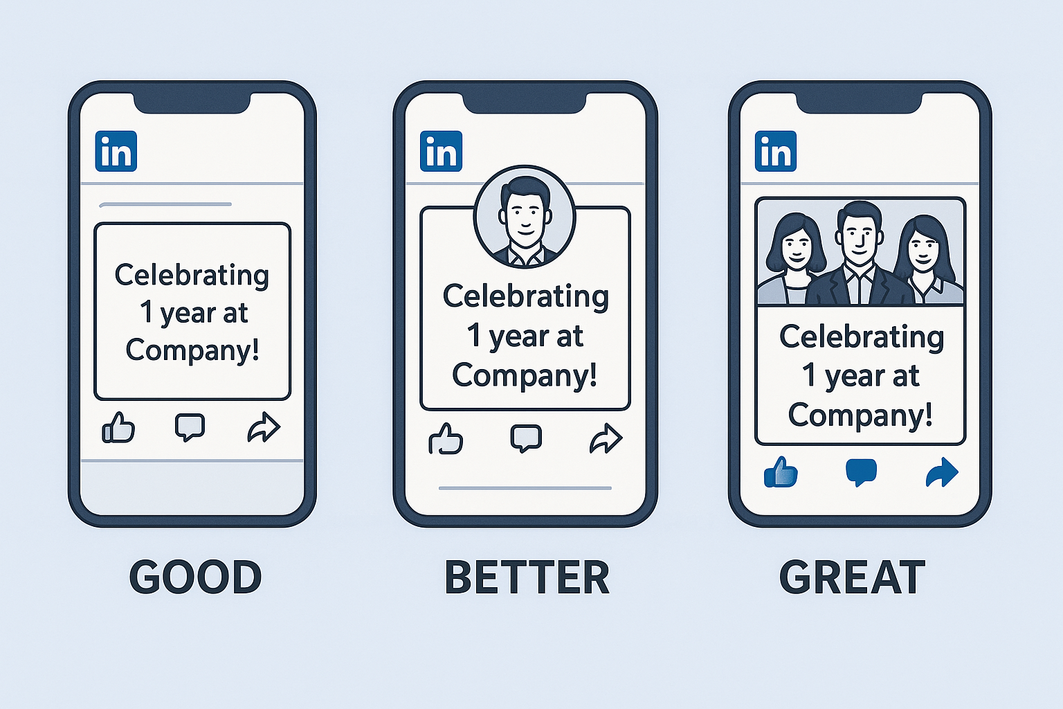 LinkedIn posts that include an image get twice the engagement of text-only posts. When you combine a work anniversary (30% boost) with a photo (2x boost), you create a visibility explosion.