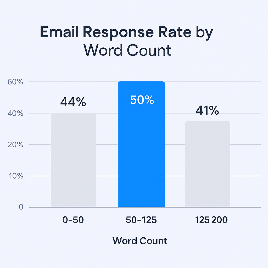 Research from Boomerang analyzed over 40 million emails and found that messages between 50-125 words achieved the highest response rates at 50-60%. Meanwhile, emails longer than 200 words saw response rates drop to 24%.