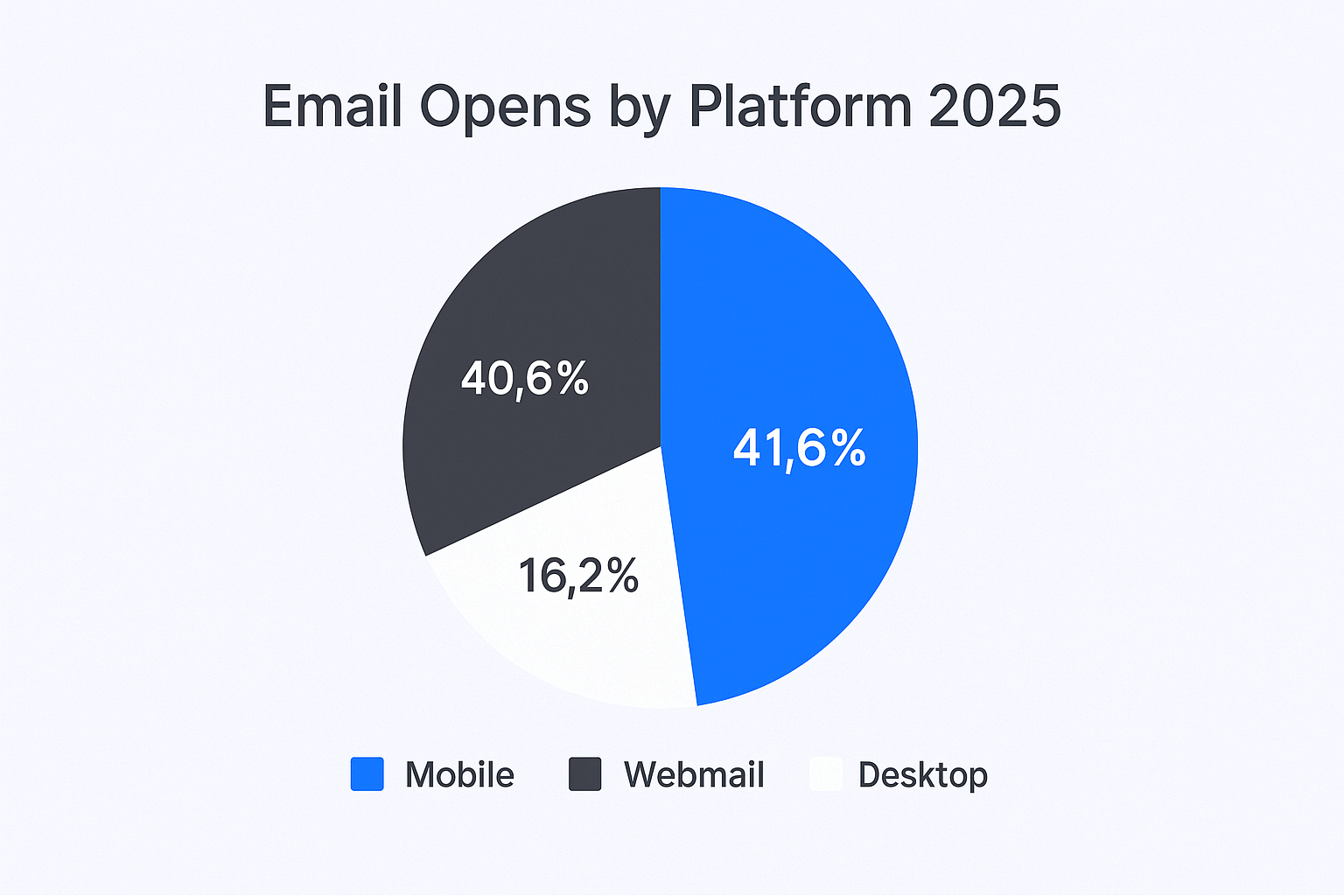 The numbers don’t lie – mobile email has taken over. Mobile clients account for 41.6% of email opens, followed by webmail opens at 40.6% and desktop opens at 16.2%. This shift represents one of the most significant changes in digital communication behavior we’ve seen in the past decade.