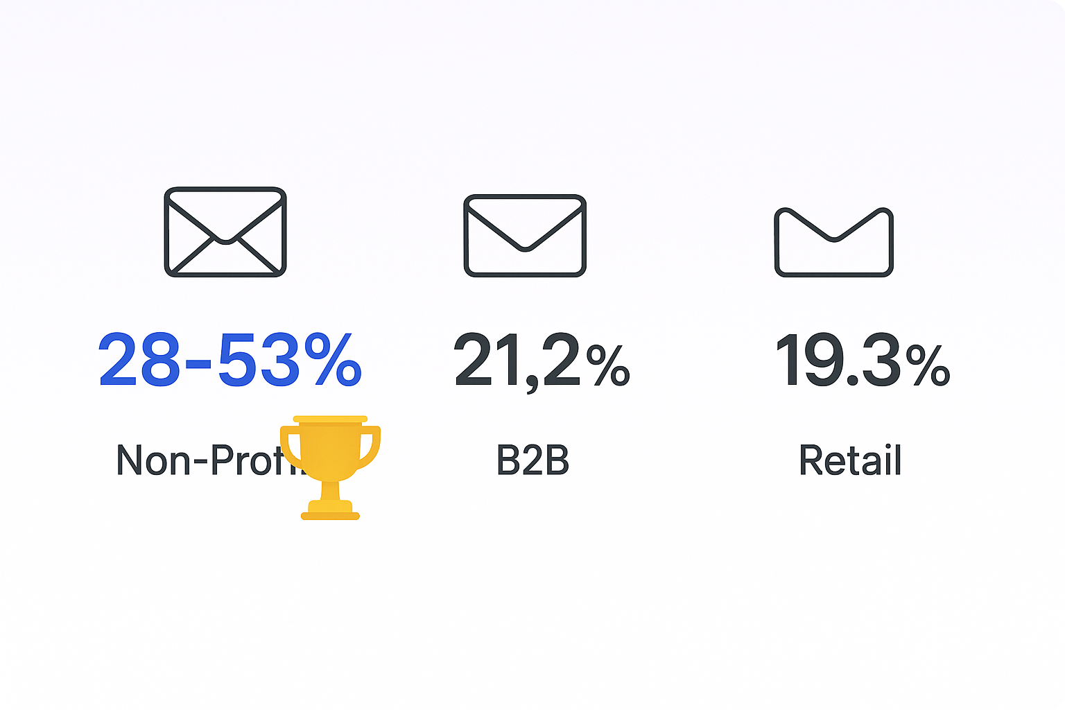 Non-profit email open rates range from 28-53%, significantly higher than most industries. The variation depends on organization size, email type, and audience segmentation.