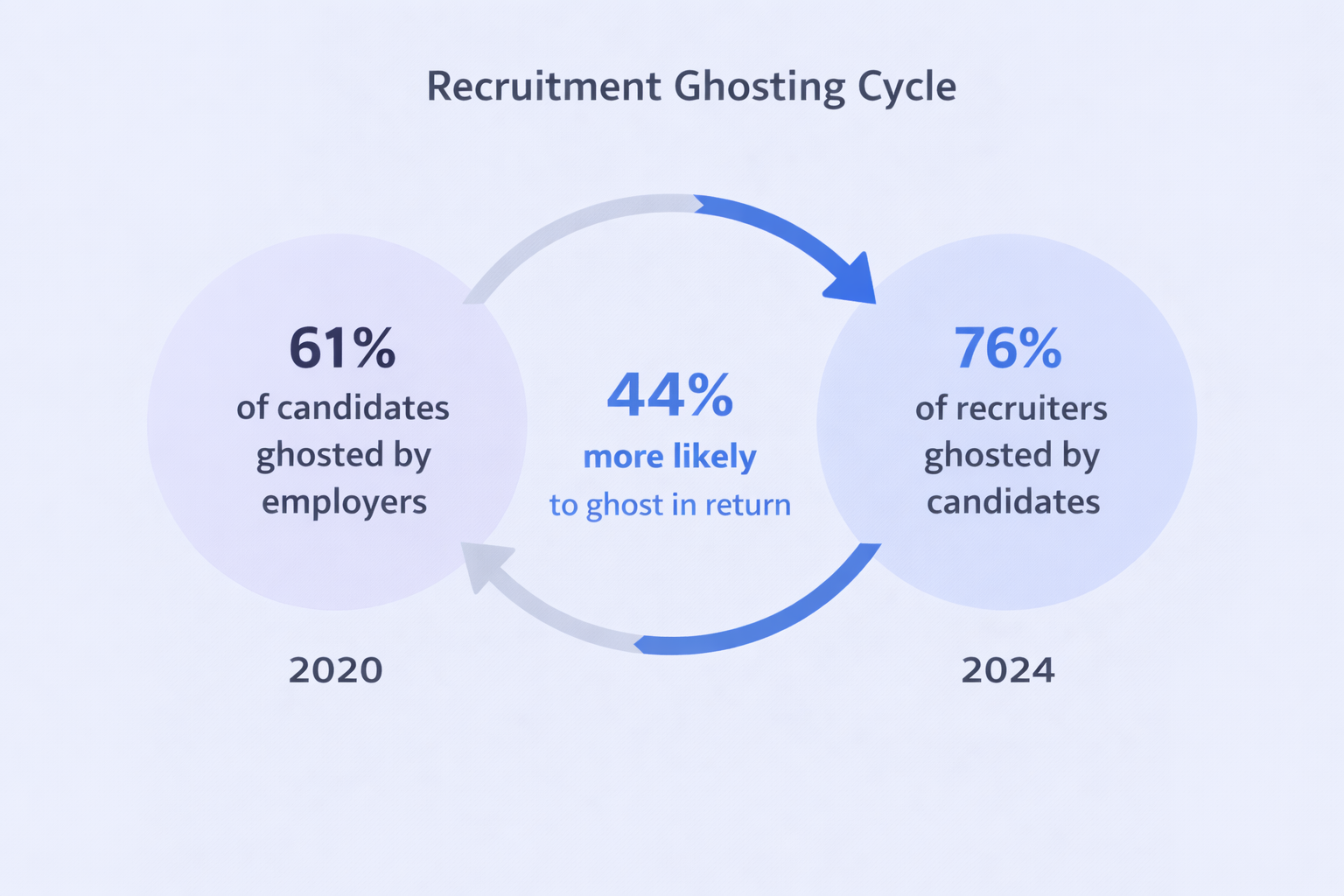 Paradoxically, 76% of recruiters also report being ghosted by candidates. This creates a destructive feedback loop: candidates experiencing ghosting become 44% more likely to ghost employers in return.