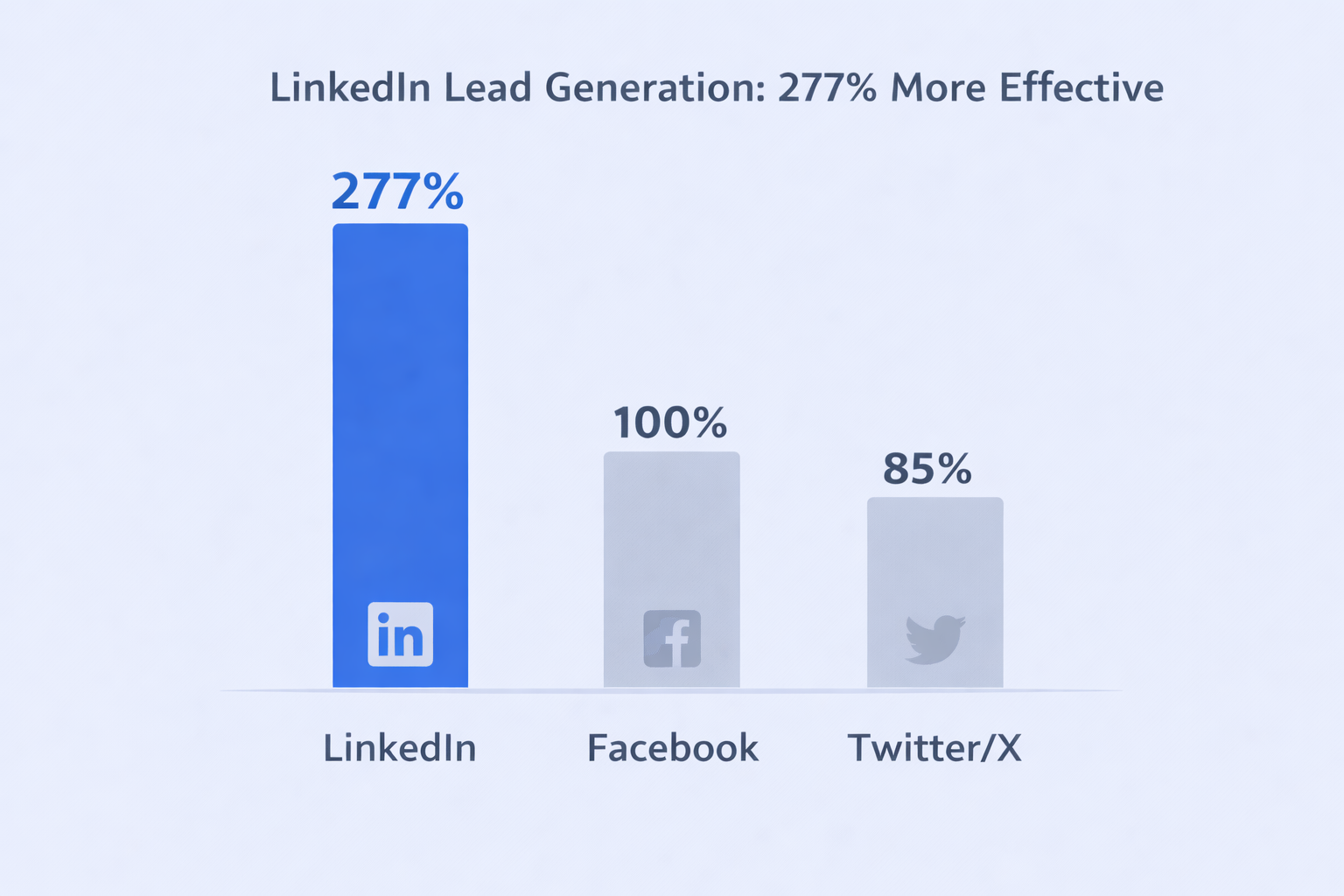 - LinkedIn 277% more effective for lead generation than Facebook/X – 89% of B2B marketers using LinkedIn for lead generation with 40% rating it #1 most effective channel for high-quality leads