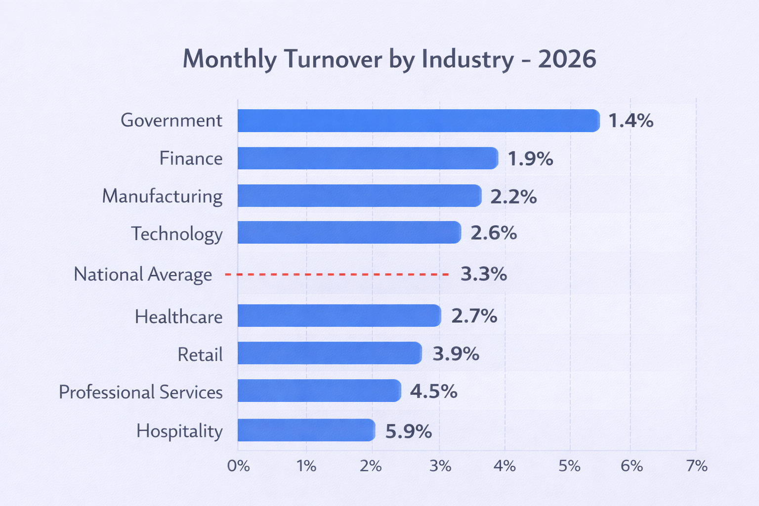 - National average monthly turnover rate: 3.3% – industries ranging from Government 1.4% (lowest) to Leisure & Hospitality 5.9% (highest) showing dramatic variation