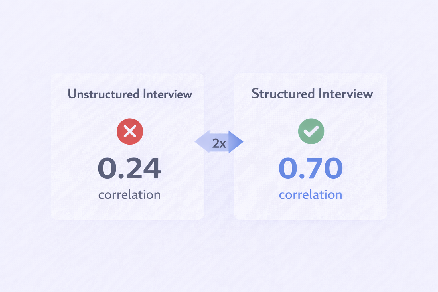 Unstructured interviews have a 0.24 correlation with job performance—basically worthless. You might as well flip a coin.