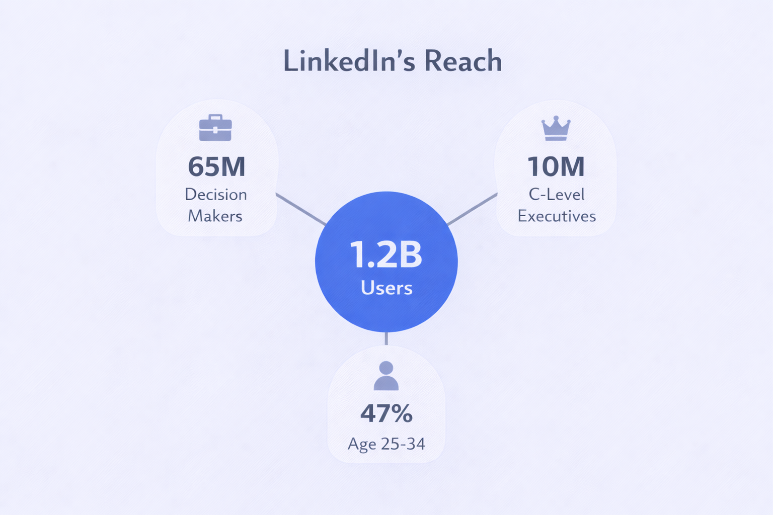 - 65 million decision-makers active on LinkedIn including 10 million C-level executives – 47.3% aged 25-34 (mid-career sweet spot), 53% earning over $100K annually creating premium talent pools