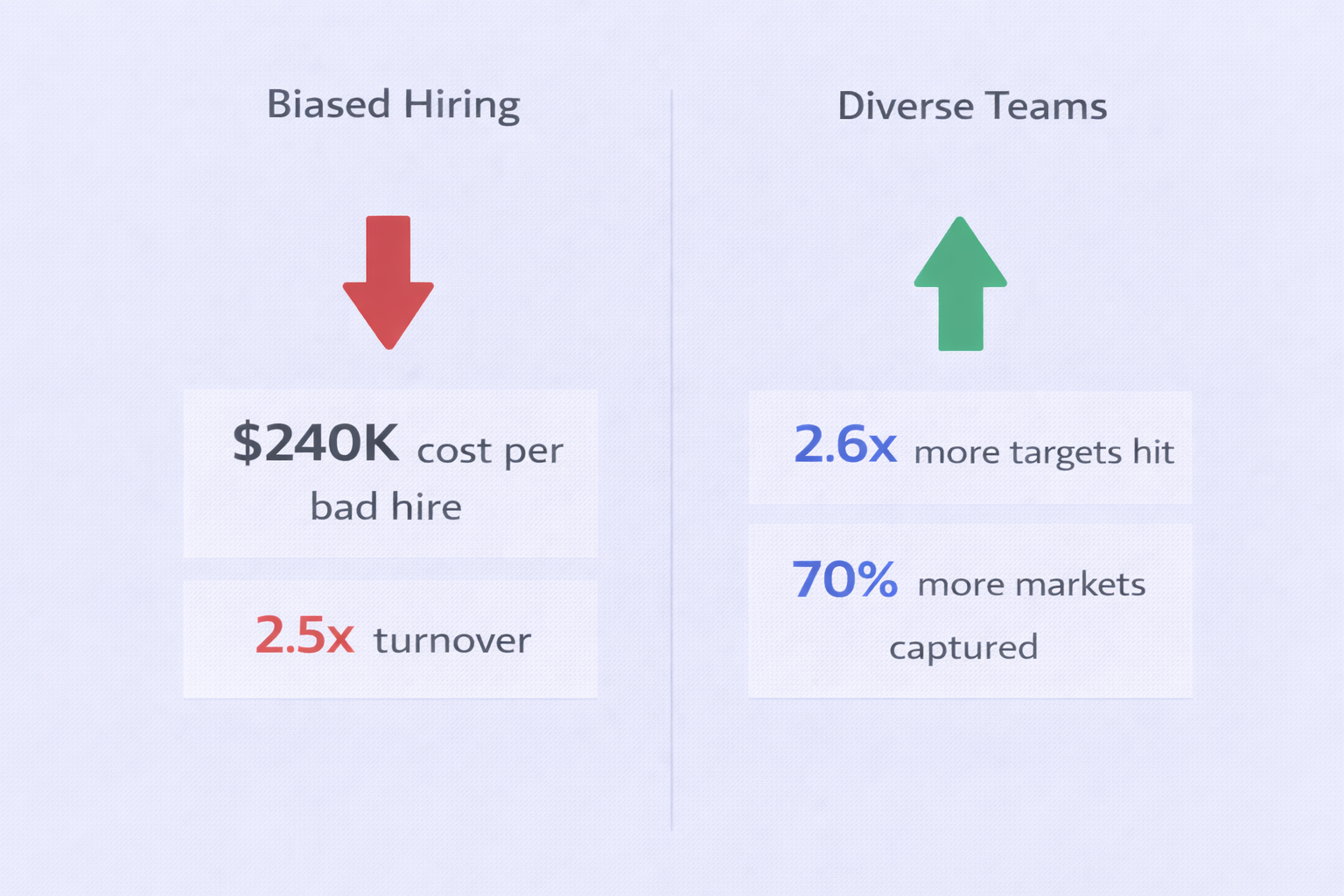 Bad hires from biased processes cost up to $240,000 each. Meanwhile, diverse organizations hit financial targets 2.6x more often, capture 70% more new markets, and experience 22% lower turnover. Bias hiring directly reduces revenue and increases costs.