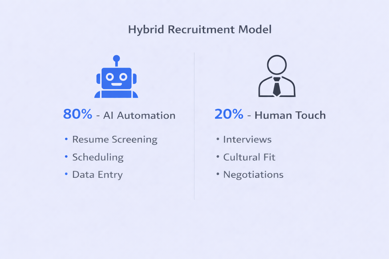 The solution? A hybrid model where AI handles 80% of administrative tasks—data entry, scheduling, initial screening—while humans focus on the remaining 20% that requires empathy, negotiation, and cultural assessment. This approach saves recruiters 4-7 hours weekly while maintaining the human touch that candidates value.
