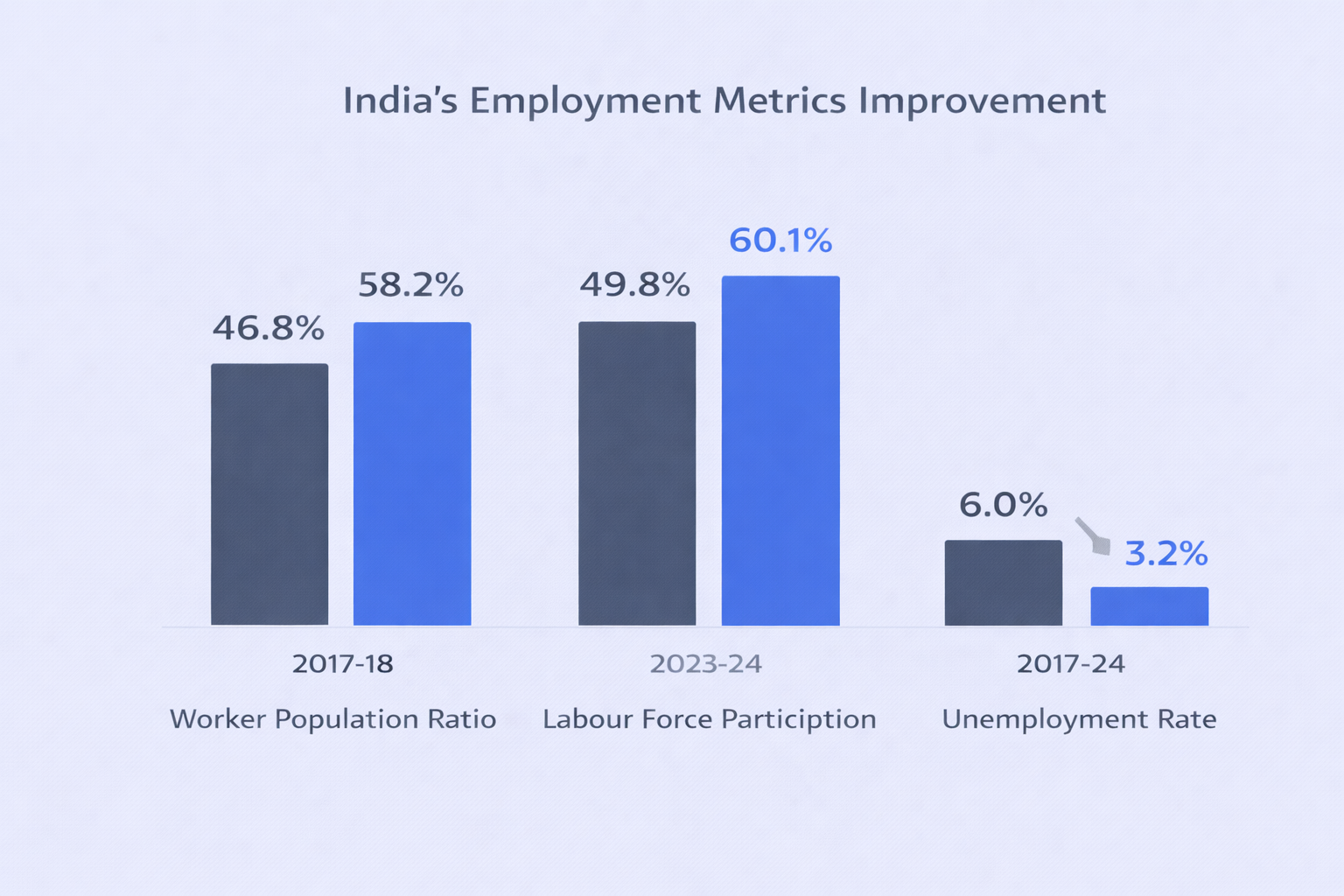 - Worker Population Ratio: Increased from 46.8% (2017-18) to 58.2% (2023-24)