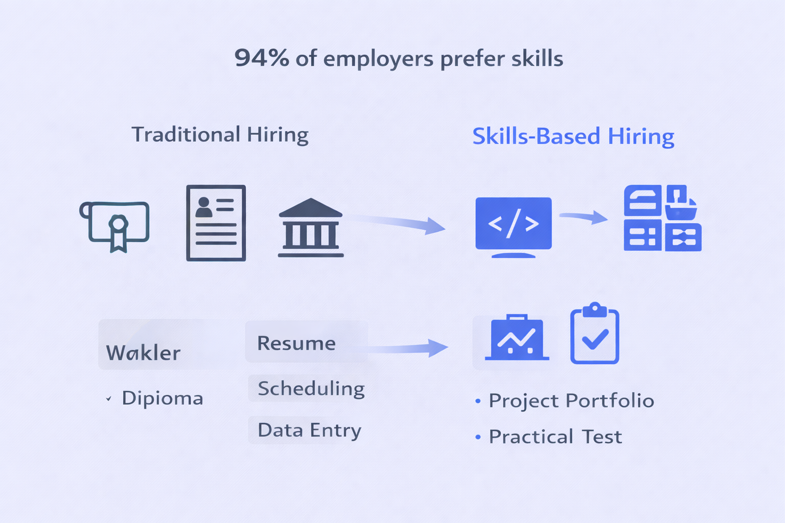 - 94% of employers believe practical abilities better predict job performance than degrees – skills-based hiring driven by 60% of business leaders doubting hiring decisions within six months of recruitment
