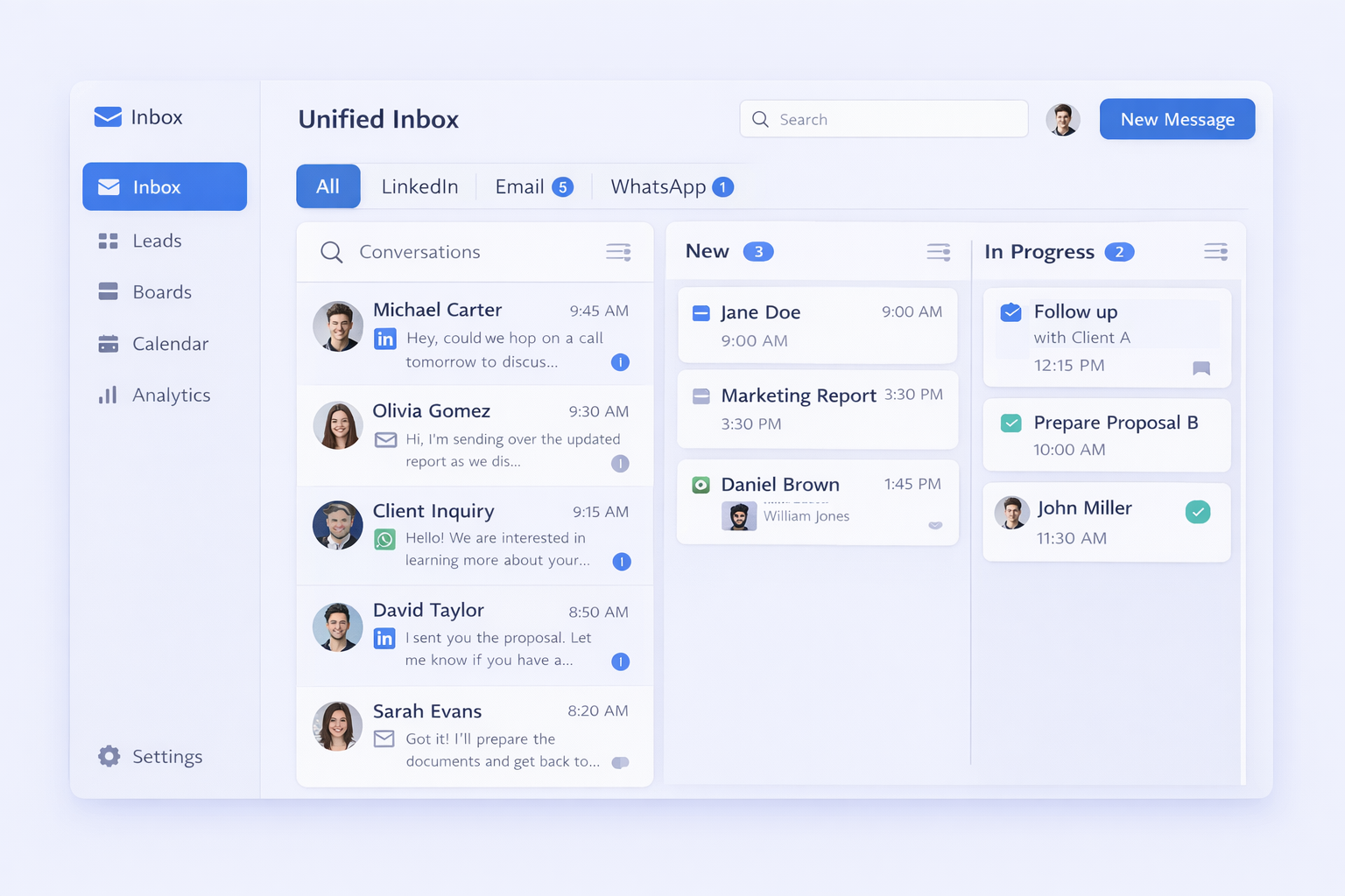 Unified Inbox: Every channel in one place. LinkedIn DMs sitting next to WhatsApp messages next to emails.
