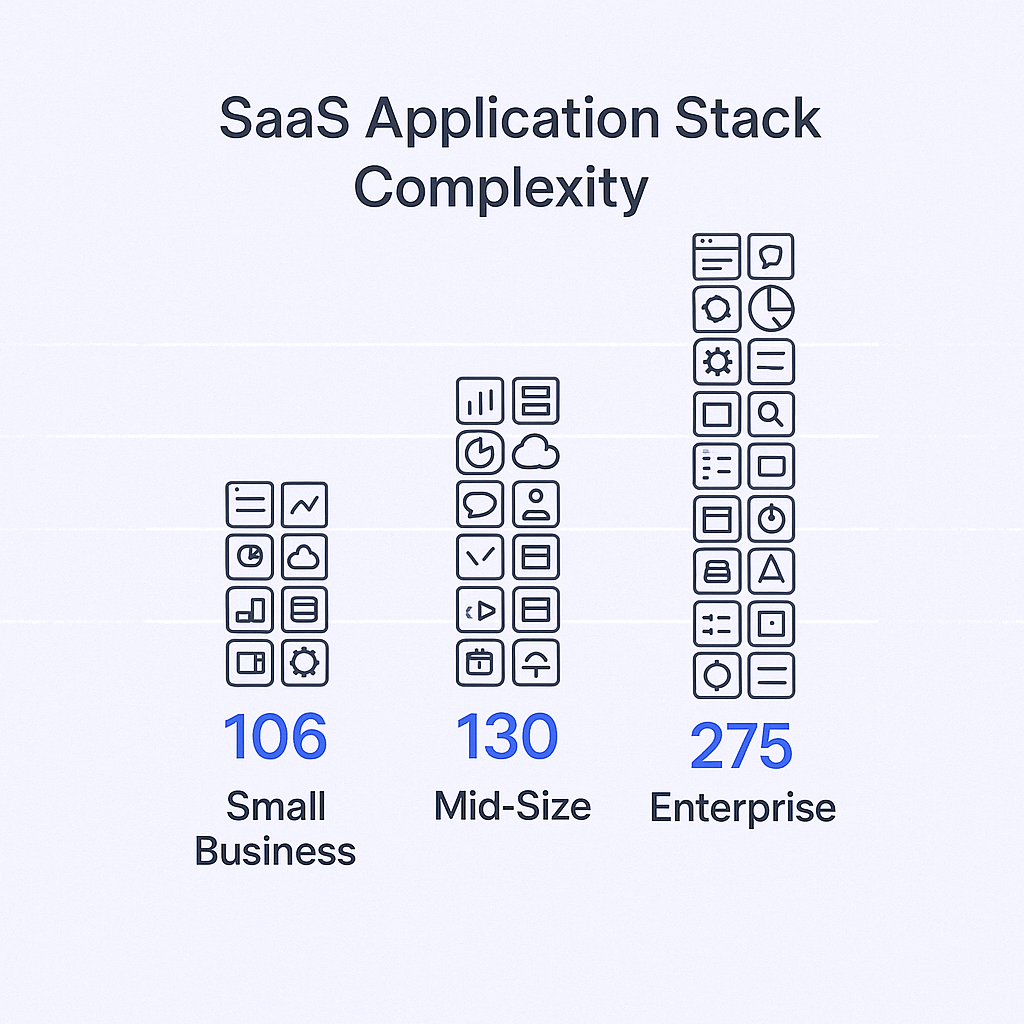 - Large enterprises with 1,000+ employees use an average of 275 apps – showing massive SaaS stack complexity