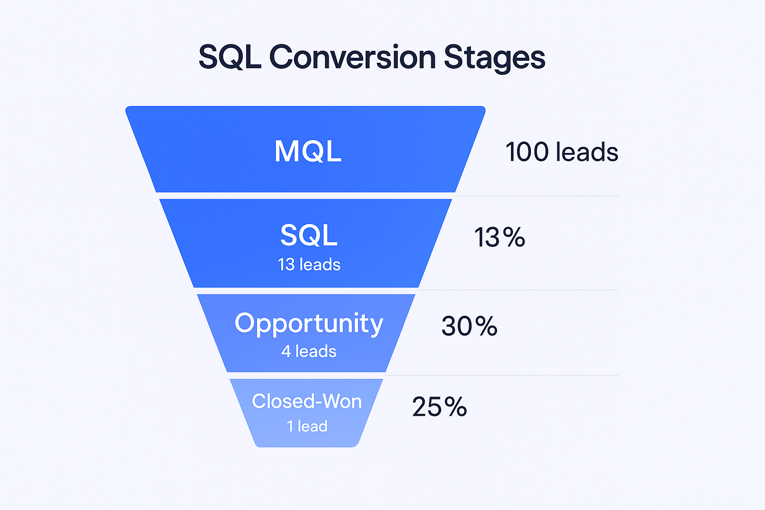 - SQLs convert to opportunities at rates of 20-30%, compared to just 5-15% for marketing qualified leads