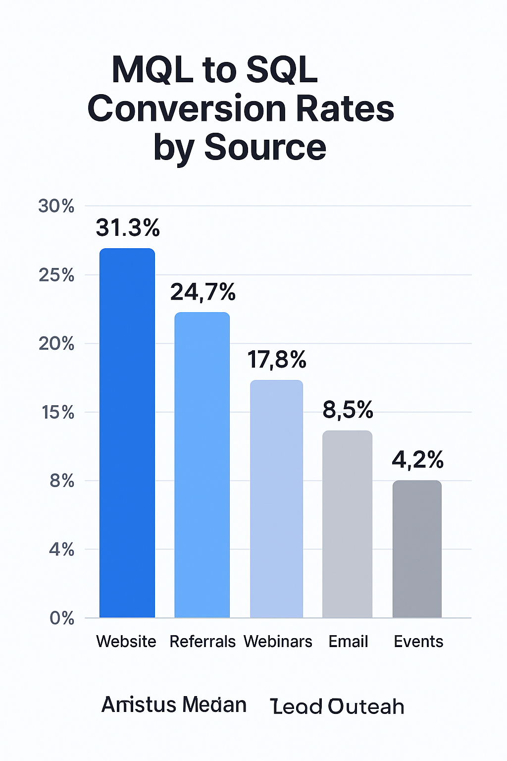 - Website leads convert at 31.3%, customer and employee referrals hit 24.7%, and webinars reach 17.8% MQL to SQL