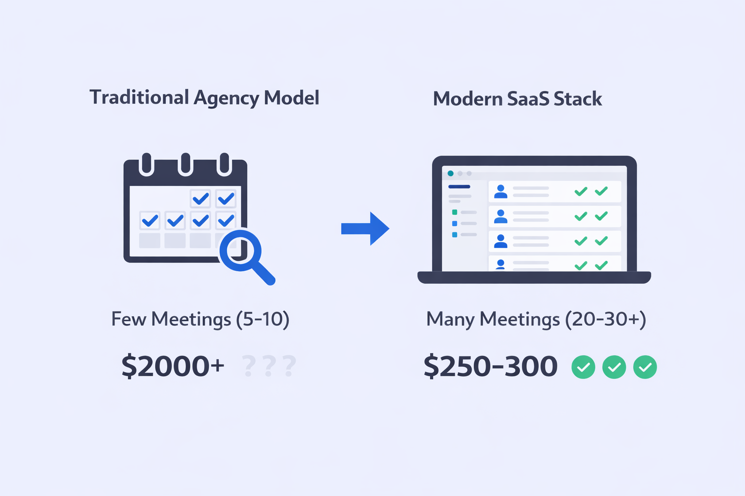 The gap widens at scale. Companies switching from agencies to SaaS stacks report 47% reduction in customer acquisition costs while increasing meeting volume by 2-3x (HubSpot, 2025).