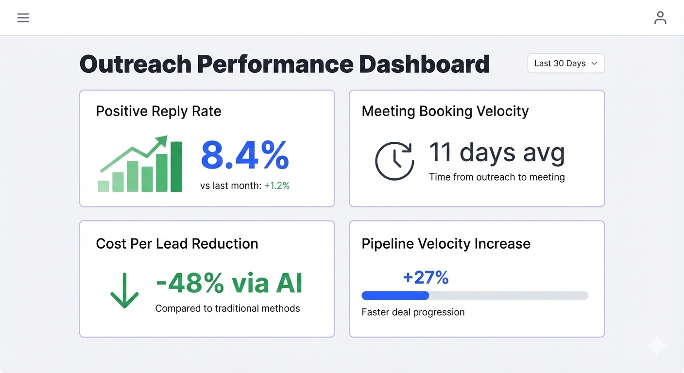 The mindset shift that matters most: stop obsessing over open rates and start tracking revenue metrics. What actually matters is positive reply rate (target: 5–10%+), meeting booking velocity (goal: under 14 days from first touch), and cost per lead (AI typically reduces this by 50%).