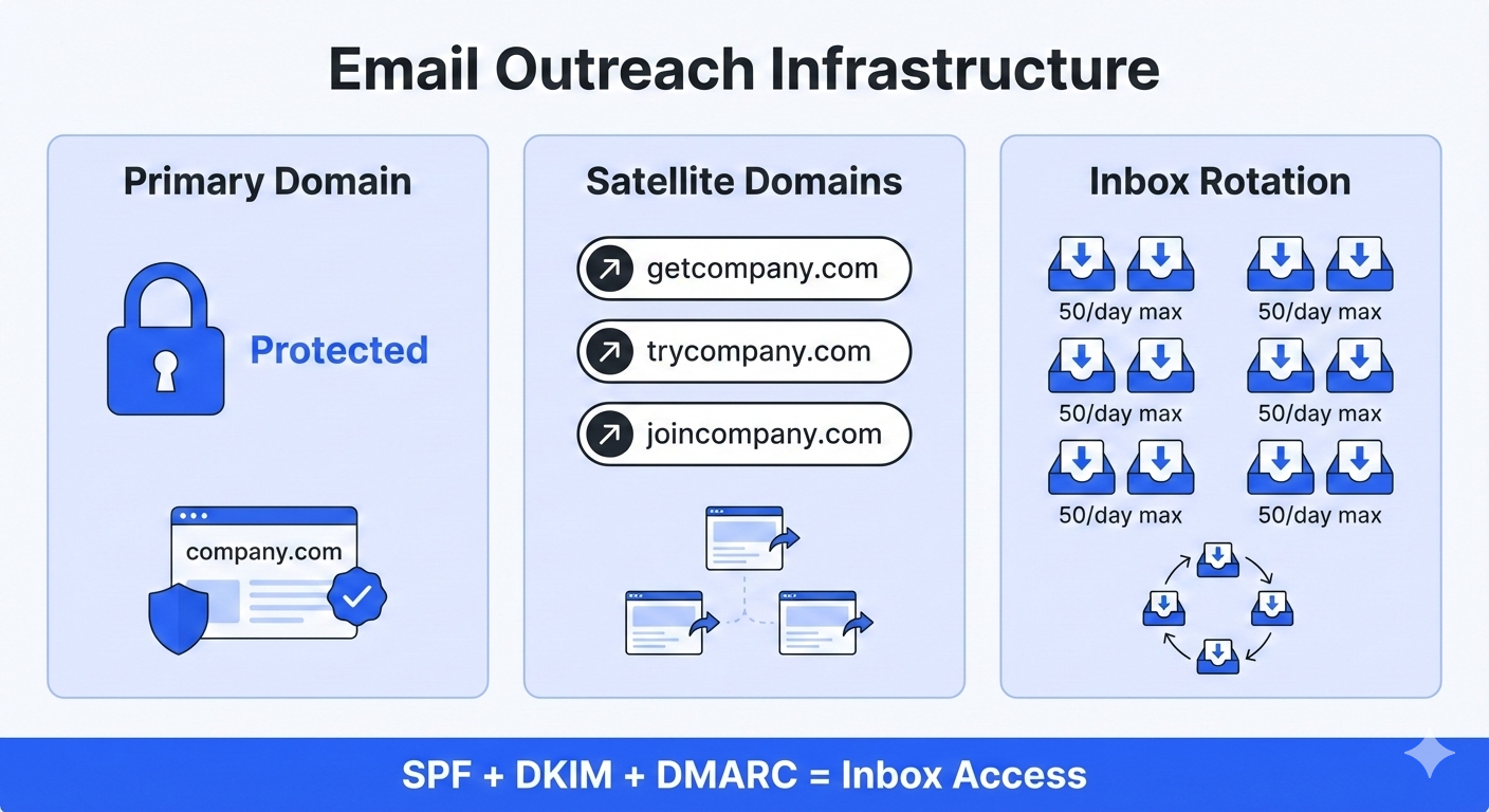 The most important move before you scale? Protect your primary domain. Use secondary “satellite” domains exclusively for prospecting (getcompany.com, trycompany.com). This prevents reputation bleed — where spam flags on your outreach domain end up blocking your real business emails like invoices or support tickets.