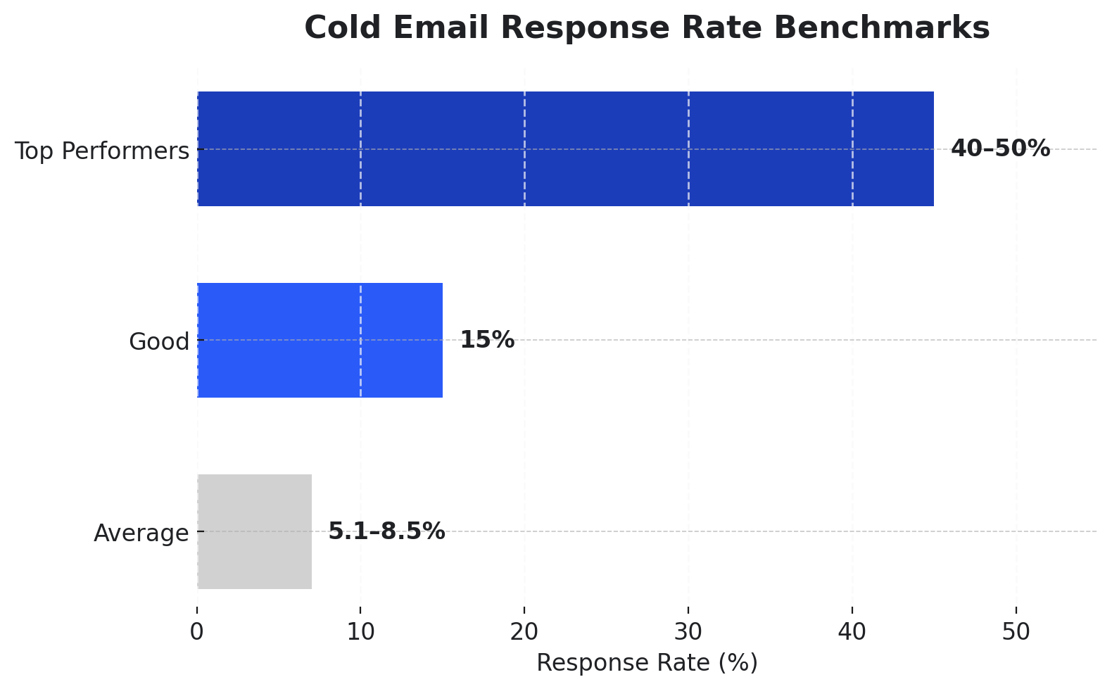 Cold email response rates range from 5.1% to 8.5% across industries, according to recent studies. But here’s the kicker: a “good” reply rate is 15% or higher, and top performers consistently hit 40-50%.