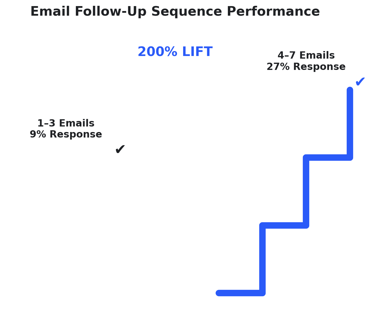 The data: Sequences with 4-7 emails see 200% higher response rates (jumping from 9% to 27%) compared to 1-3 email sequences.