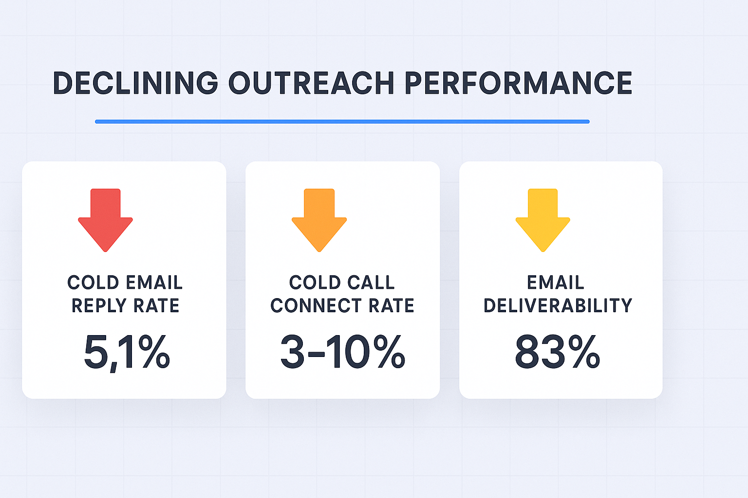 Cold email reply rates have dropped to 5.1%. Cold call connect rates are stuck between 3-10%. 17% of emails never even reach the inbox. These aren’t temporary dips—this is the new reality.