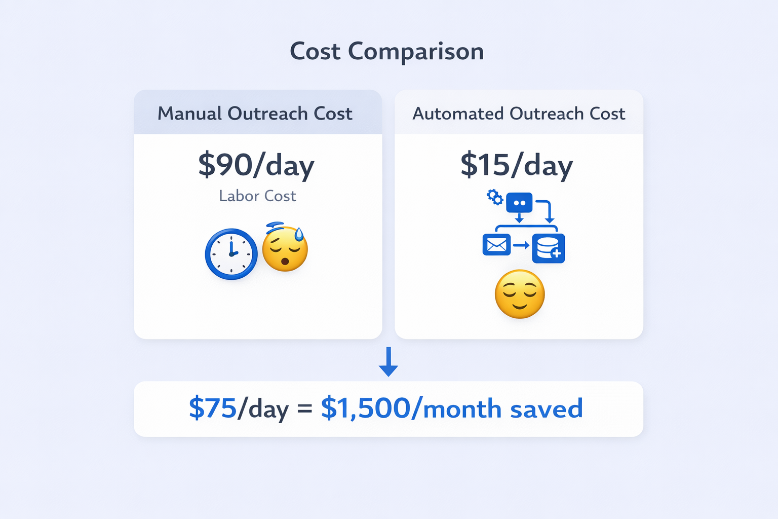 Manual outreach requires roughly 3 hours daily to send 30 connection requests and 50 emails. At a $30/hour cost, that’s $90 daily in labor.