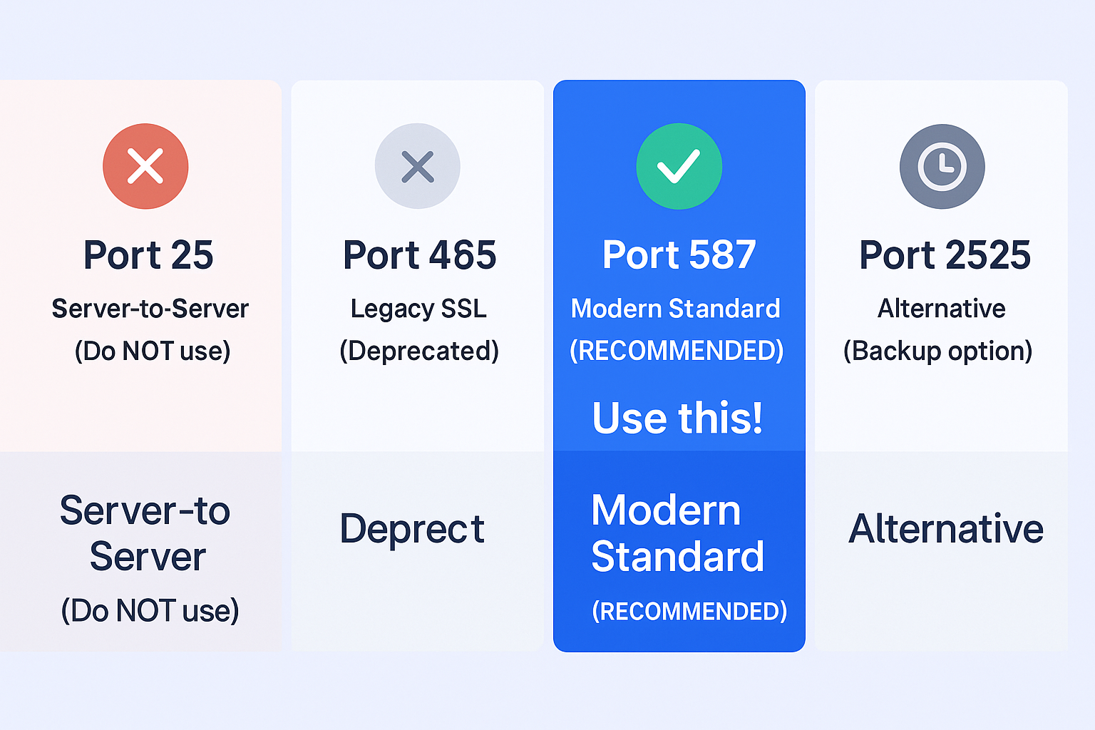 The connection starts unencrypted but upgrades to secure using the STARTTLS command. This is the modern standard because it’s more flexible – if encryption isn’t available, the connection can still proceed (though most professional services require encryption).