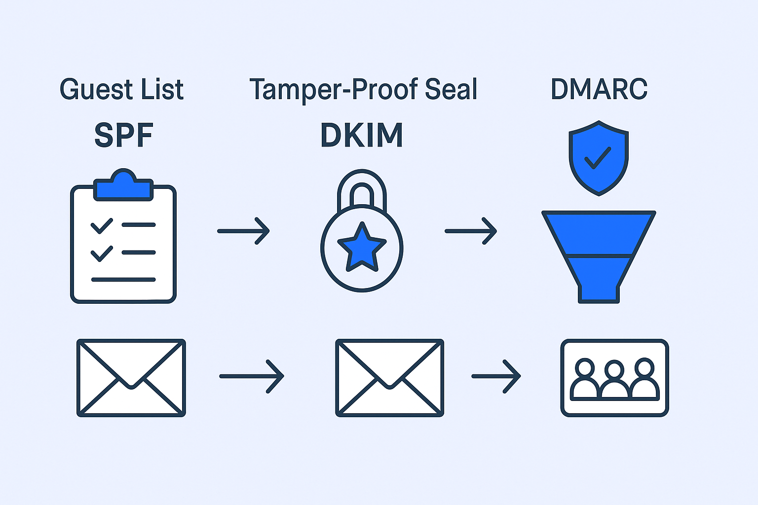 Think of email authentication like airport security—multiple checkpoints ensure only legitimate passengers (emails) reach their destination.