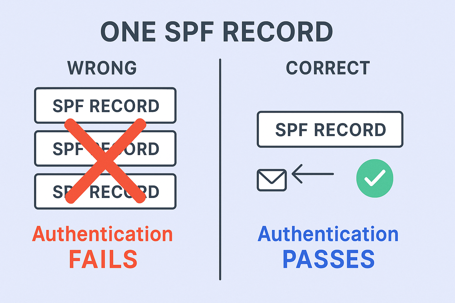 One SPF record per domain. This is the most common setup mistake. Multiple SPF records will cause authentication to fail completely.
