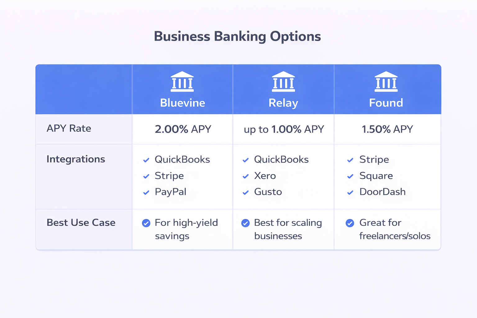 - Bluevine: Offers up to 2.0% APY on operating balances (that’s free money while you hold cash for taxes). Integrates with QuickBooks and Xero.