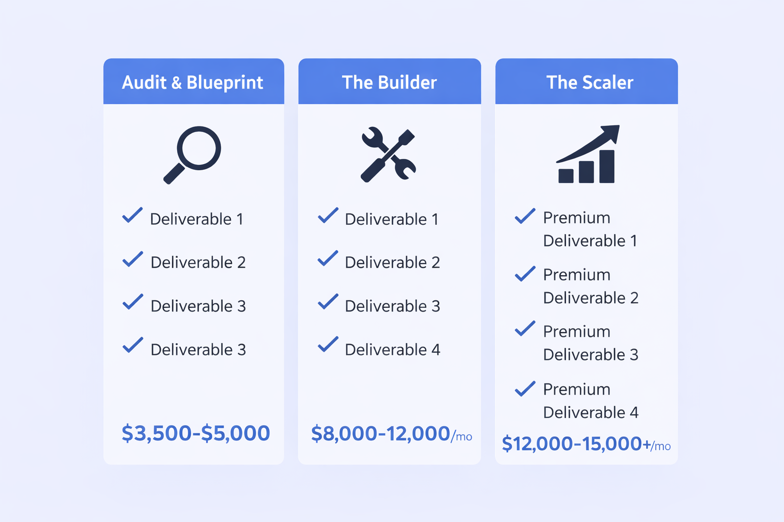 This covers 10-15 hours weekly of strategic work. The client pays a fixed fee for defined deliverables and access. You get predictable cash flow. They get consistent support without the $535,000 fulltime hire commitment.
