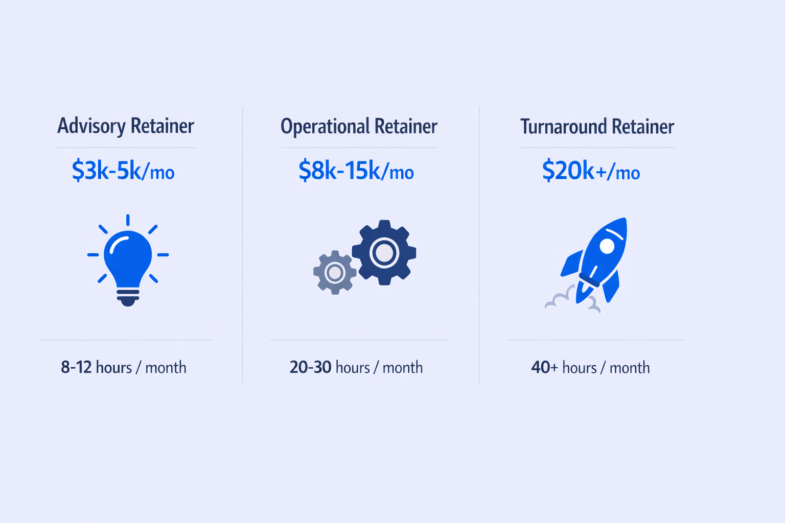 Turnaround Retainer ($20,000+/month): High-intensity crisis engagement for security breaches or failed product launches. Time commitment: 3 days/week.