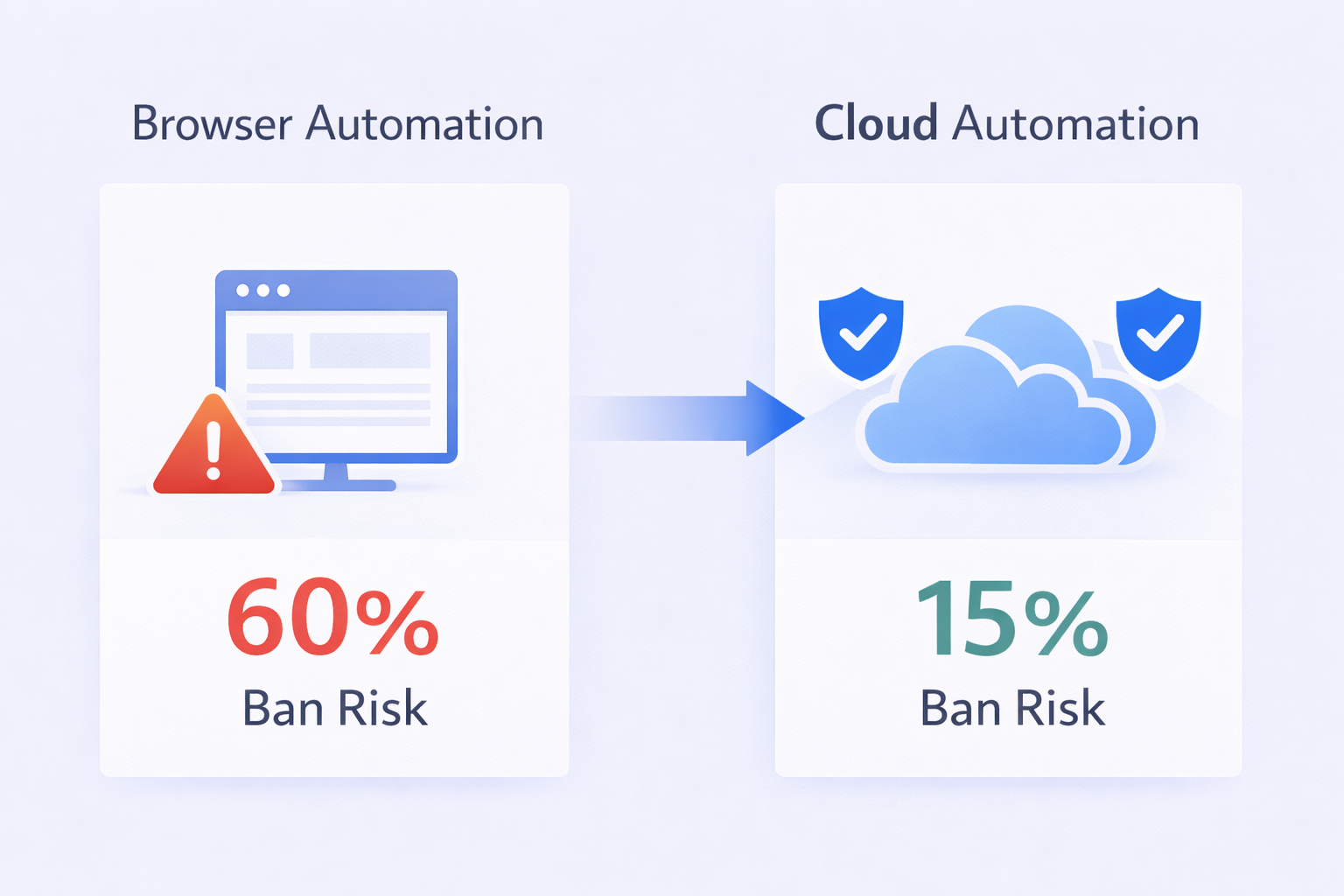Here’s what changed: LinkedIn now analyzes Document Object Model (DOM) mutations, IP address patterns, and behavioral velocity. Research shows that browser-based automation tools face a 60% higher ban risk compared to cloud-based alternatives.