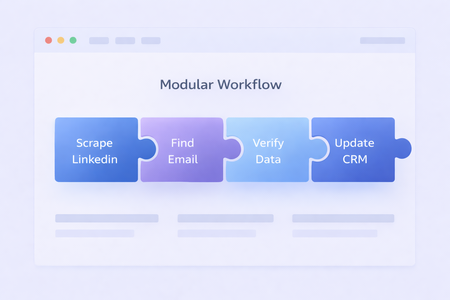 Image 1 – After “What Is TexAu?” section: “Create a clean, modern infographic showing a modular workflow system. Display 4-5 connected puzzle pieces in a horizontal flow, each piece labeled with different actions like ‘Scrape LinkedIn’, ‘Find Email’, ‘Verify Data’, ‘Update CRM’. Use soft gradients with primary colors: light purple background (#ECECFE), dark text (#1F2124), and bright blue connectors (#2A5AF8). Make it look like a professional SaaS dashboard mockup with subtle shadows and clean typography. 16:9 aspect ratio, minimalist style.”