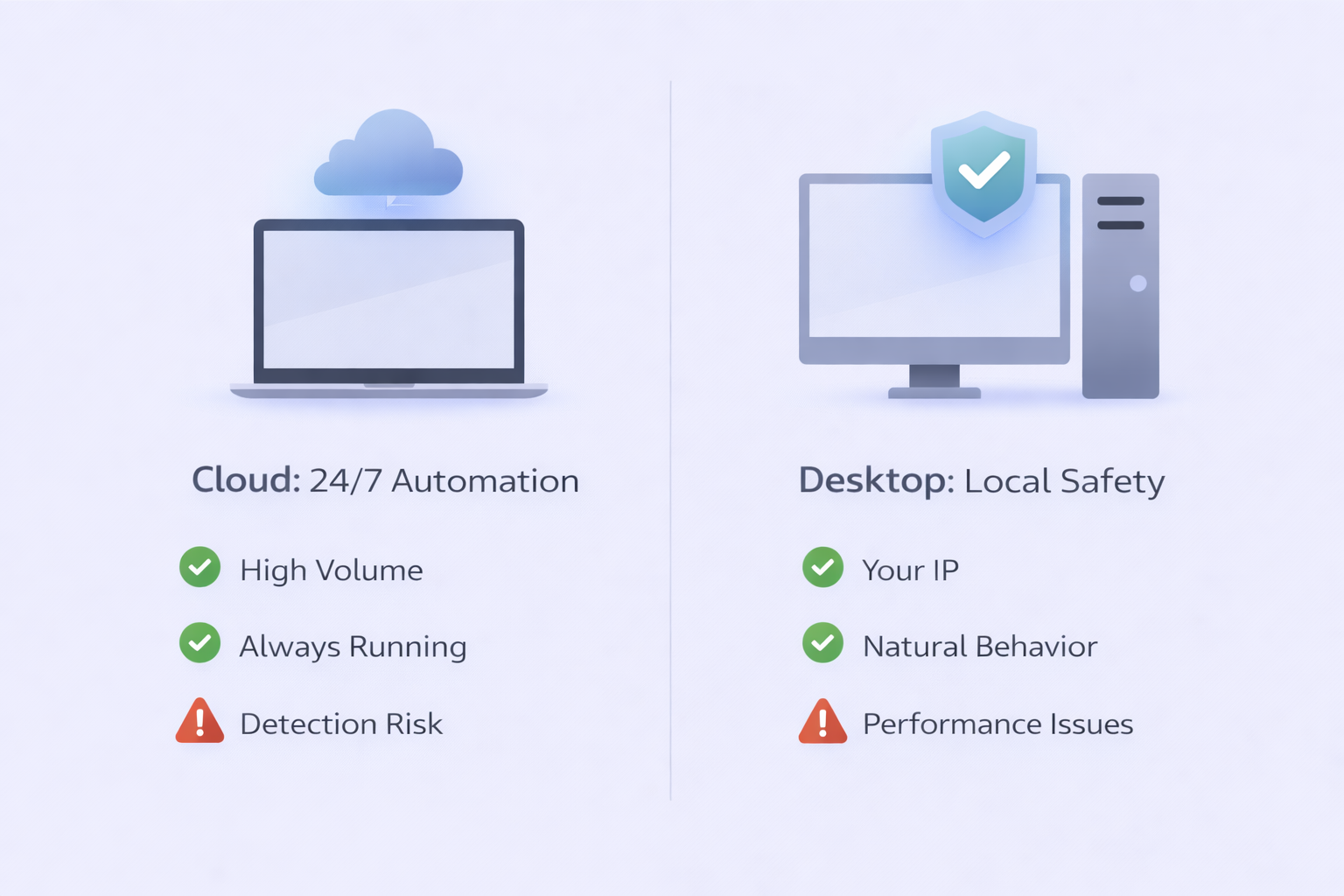 Image 2 – After “Cloud and Desktop Deployment” section: “Create a split-screen comparison diagram showing two computers side by side. Left side shows a laptop with cloud icon above it, labeled ‘Cloud: 24/7 Automation’ with checkmarks for ‘High Volume’ and ‘Always Running’ but warning icon for ‘Detection Risk’. Right side shows a desktop computer with shield icon, labeled ‘Desktop: Local Safety’ with checkmarks for ‘Your IP’ and ‘Natural Behavior’ but warning icon for ‘Performance Issues’. Use brand colors: light purple background (#ECECFE), dark text (#1F2124), blue accents (#2A5AF8), and clean icons. Modern, professional style with subtle gradients. 16:9 aspect ratio.”