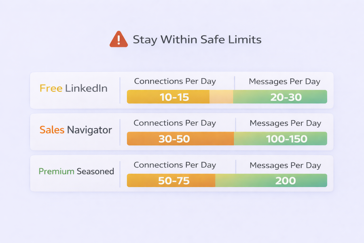 Image 3 – After “The Safety Problem Nobody Talks About” section: “Create an educational infographic showing LinkedIn automation safety limits. Display three horizontal bars or gauges, each representing an account type: ‘Free LinkedIn’ (yellow), ‘Sales Navigator’ (orange), ‘Premium Seasoned’ (green). Each bar shows daily limits: connections per day and messages per day with specific numbers (10-15, 20-30 for Free; 30-50, 100-150 for Sales Nav; 50-75, 200 for Premium). Include warning icon at top with text ‘Stay Within Safe Limits’. Use brand colors: light purple background (#ECECFE), dark text (#1F2124), blue highlights (#2A5AF8). Clean, dashboard-style design with clear typography. 16:9 aspect ratio.”
