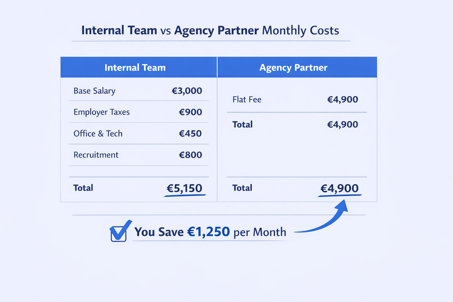 For many sales leaders, the decision to hire an agency comes down to the “Cost Per Productive Hour.” When you factor in the high cost of recruitment, employer taxes in the Netherlands, office space, and the specialized tech stack (which can easily exceed €250,000 a year for enterprise tools), outsourcing often becomes the more efficient path.