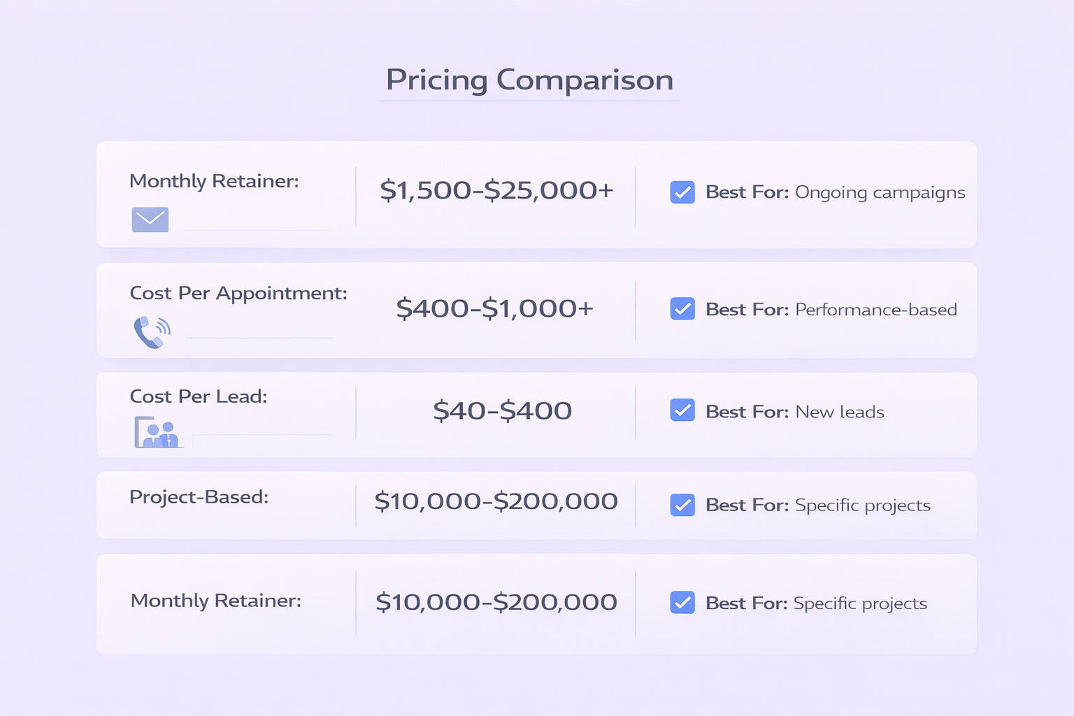 Cost Per Appointment (CPA): $400-$1,000+ per booked meeting. Ideal for high-intent opportunities ready to close.